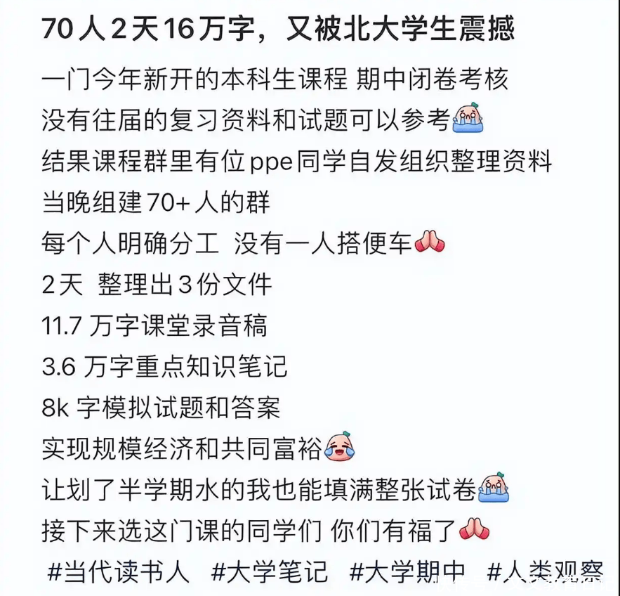 结果可想而知,大家齐心协力,这次考试自然顺利过关。这件事不光我们外人觉得震撼,就连一些被拉进群的北大学生自己也感慨,说以前自己的格局太小了,没想到在高学历的圈子里,大家早就习惯了这种“共同创作、知识共享”的模式。