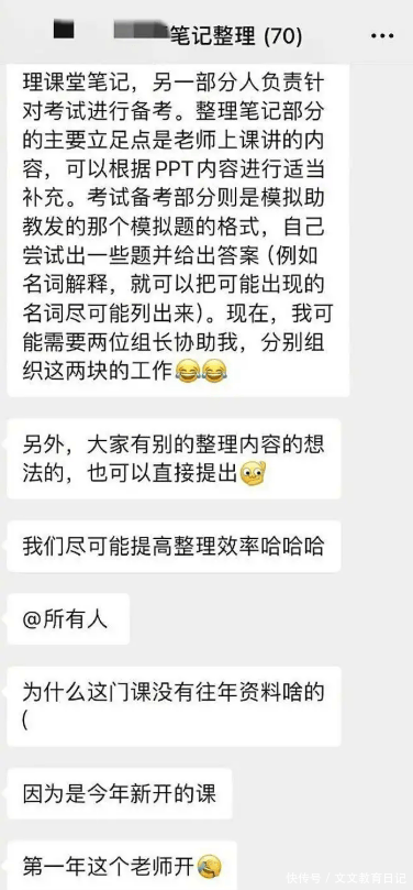 但北大的学生不慌不忙,他们当中有人迅速建了一个多达70人的大群,只用两天时间,靠大家分工合作,居然整理出了一份16万字的复习资料!
